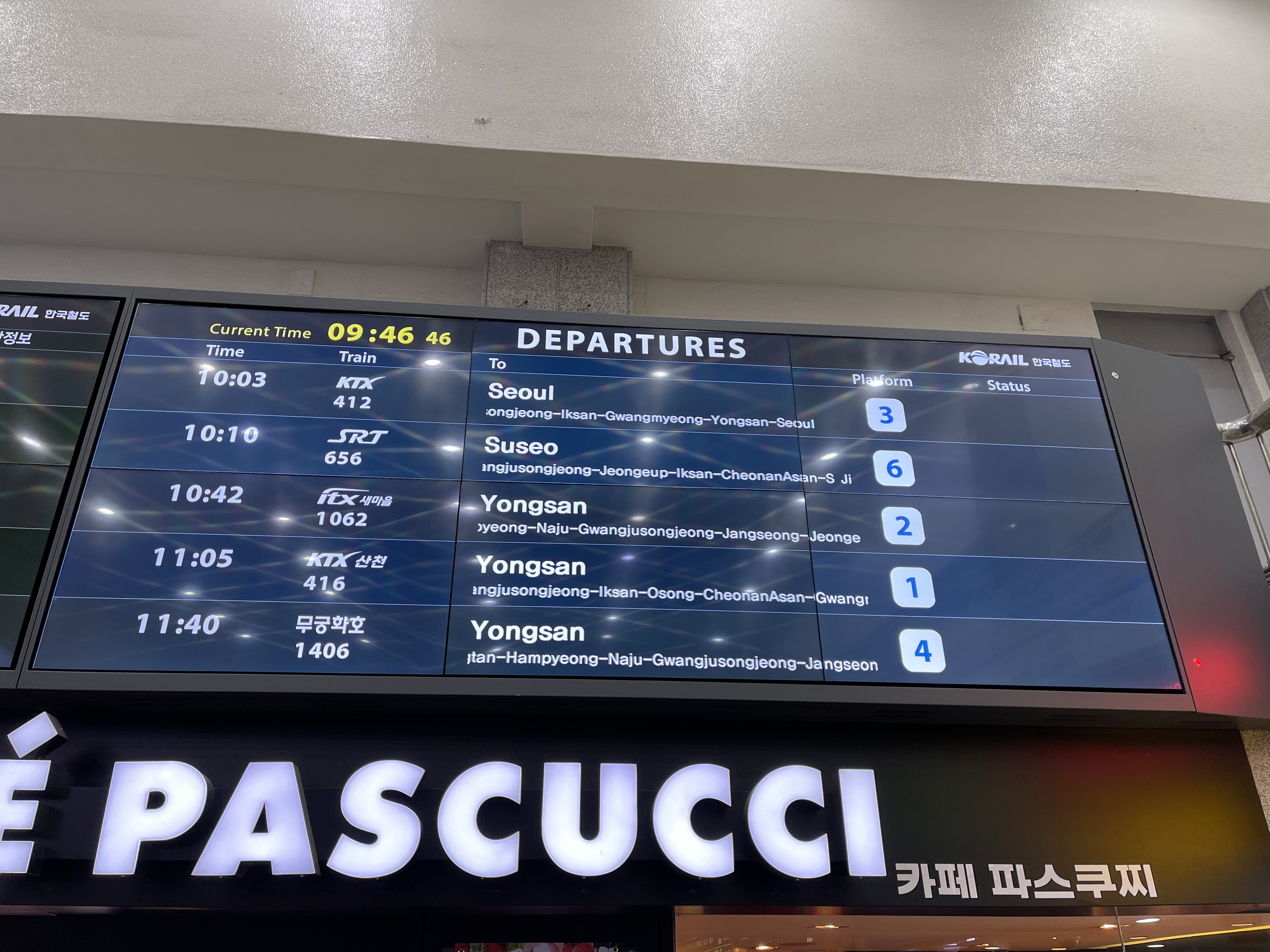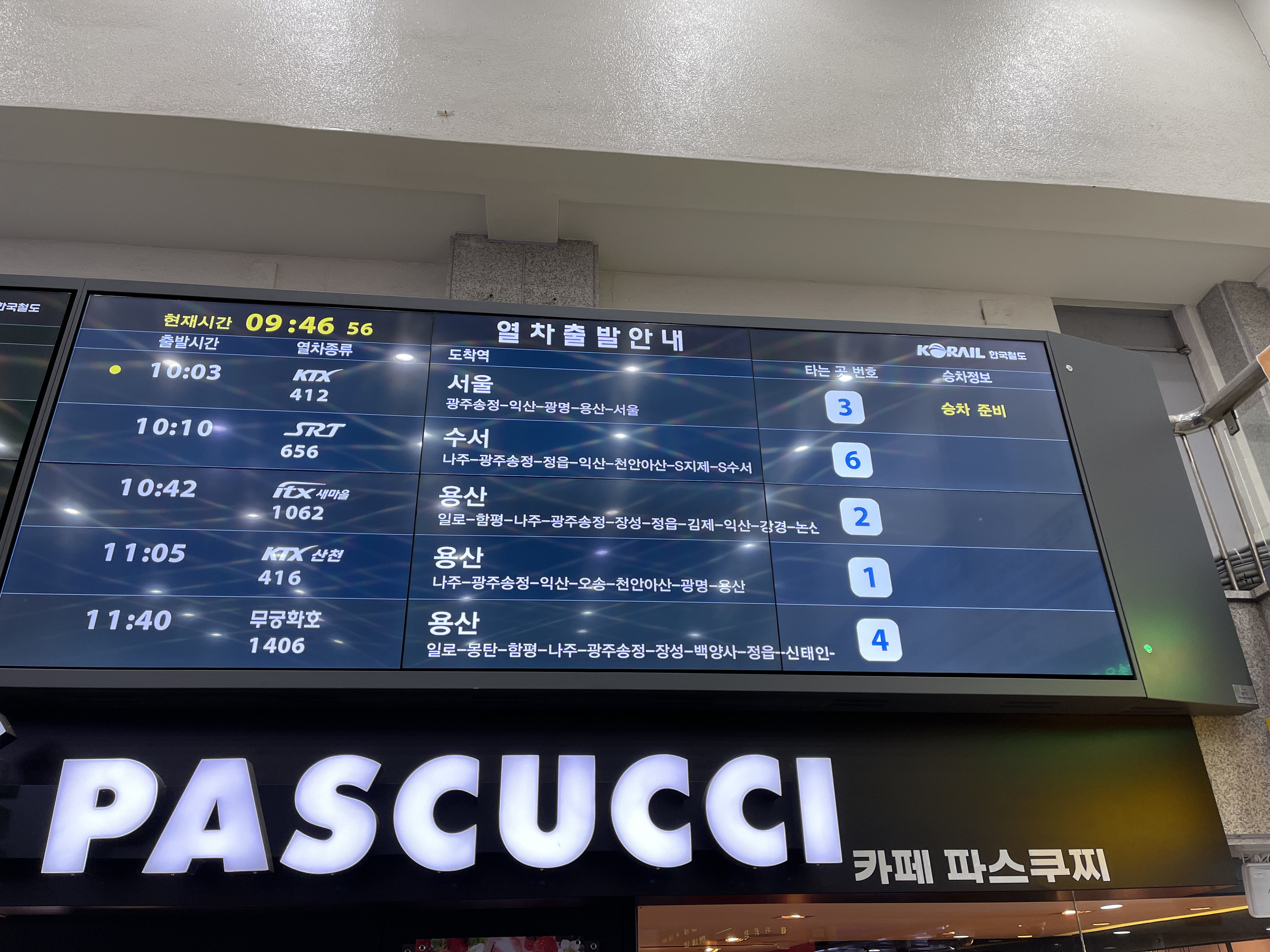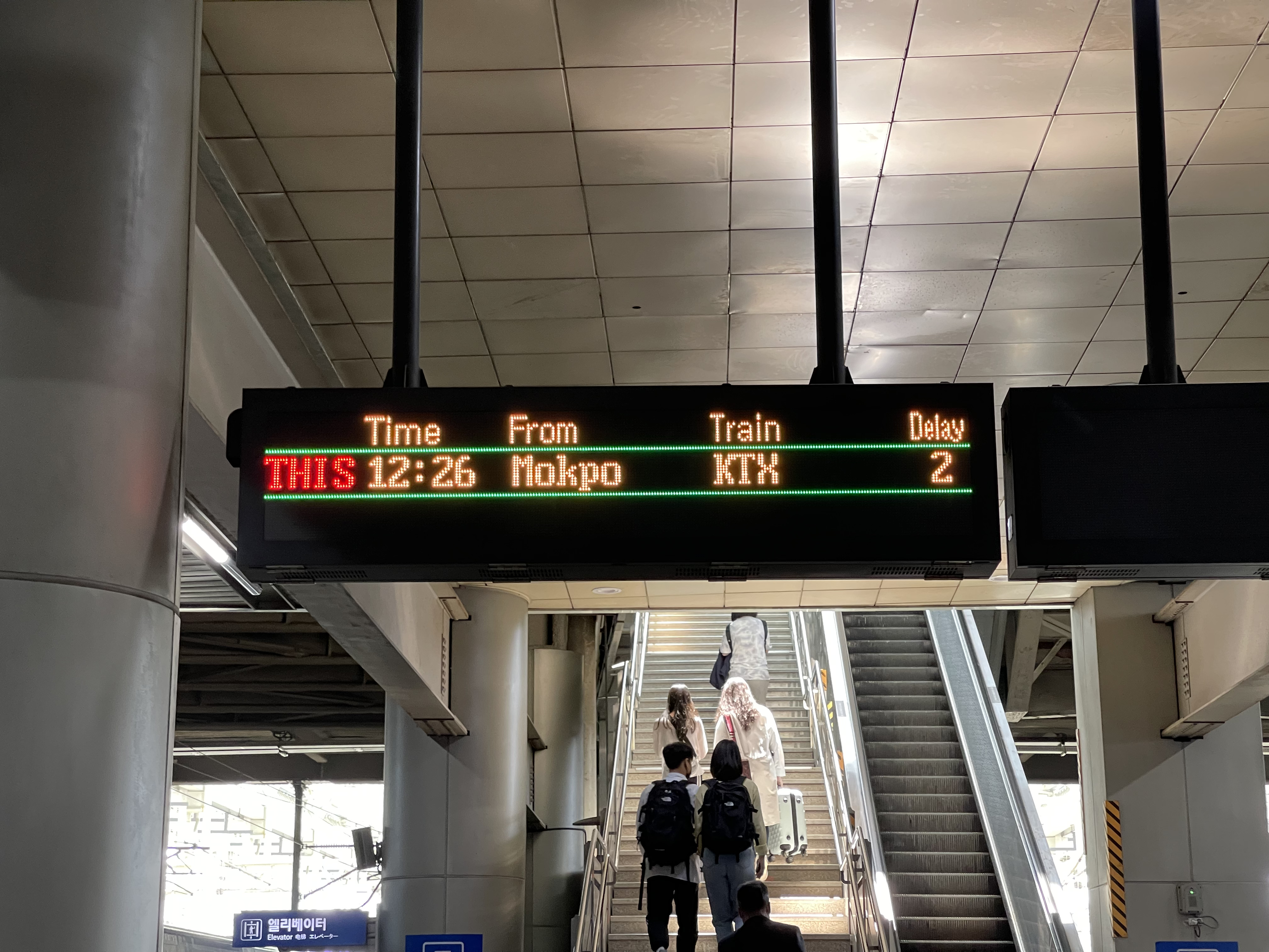 목포역 출발 전광판. 오늘 타는 열차는 가장 상단에 있는 KTX #412 열차로, 여기에서만 봐도 정차역이 상당히 적음을 알 수 있습니다. 이 열차는 목포-용산 열차를 서울역까지 연장한 열차라, 사실상 용산역까지의 정차역은 광주송정, 익산 및 광명역으로, 광명역을 제외하면 필수정차역에만 정차함을 알 수 있습니다.