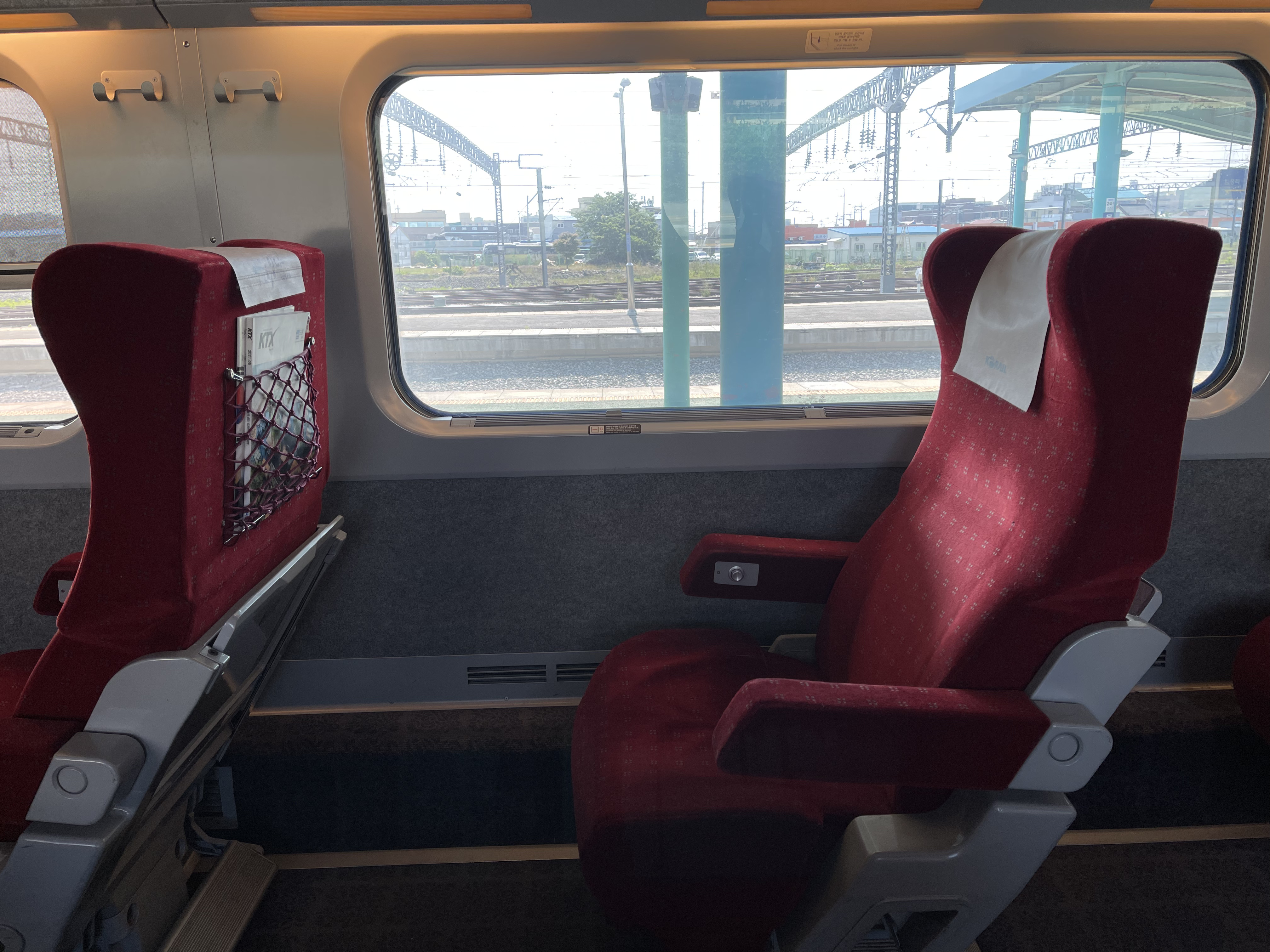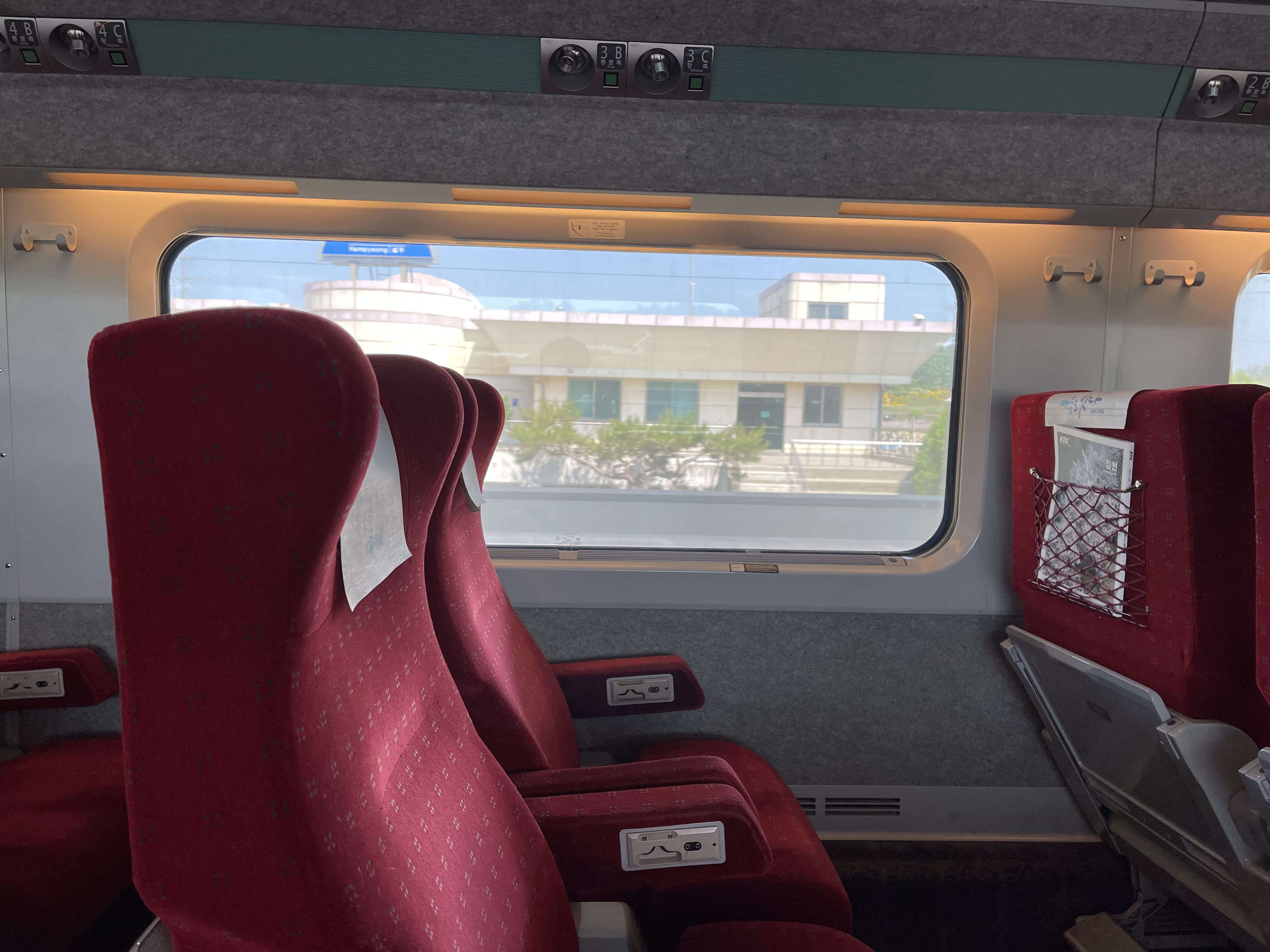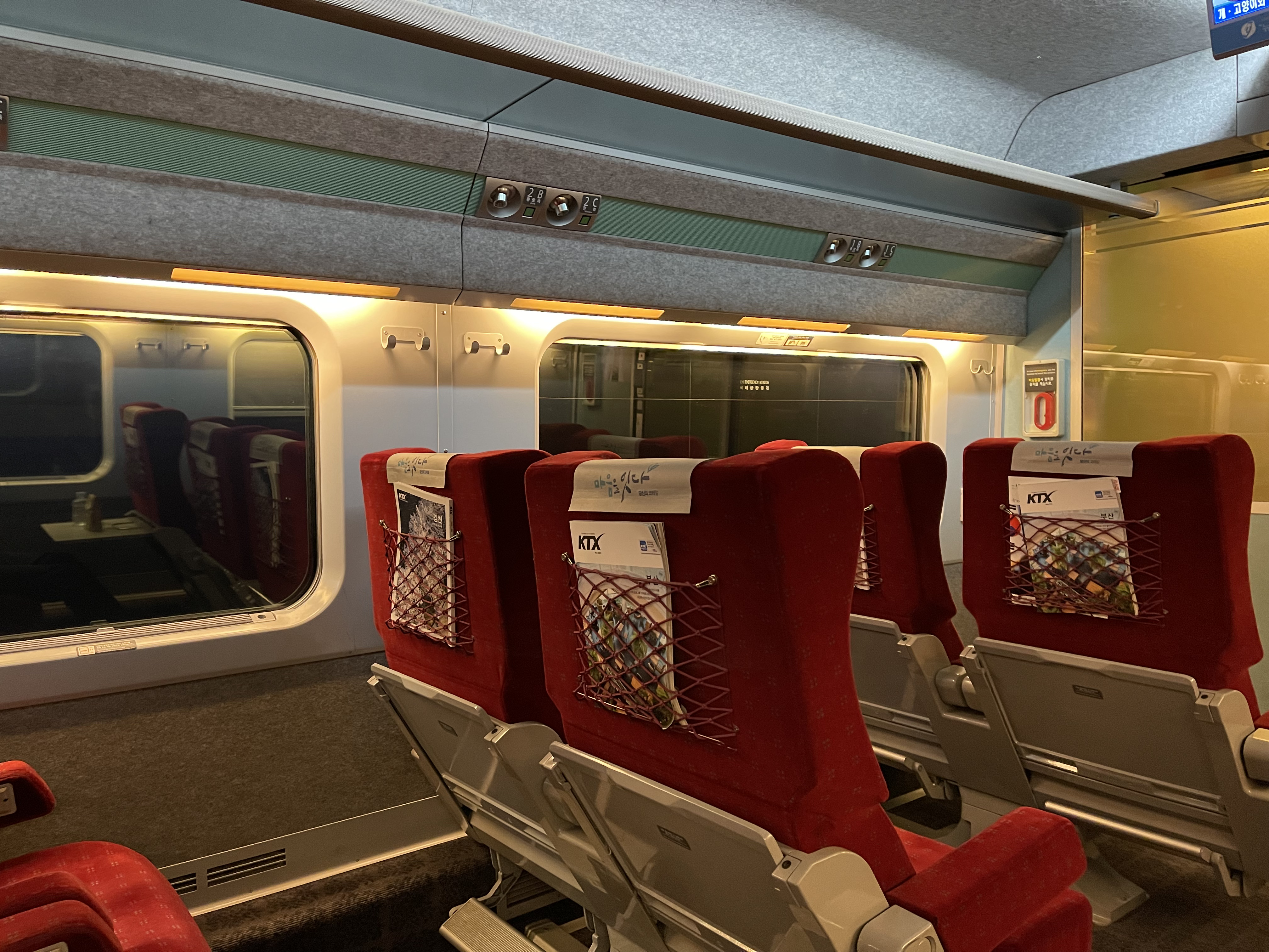 빨간 시트의 특실 시트들이 저를 맞이해 줍니다. KTX-1의 특실은 일반실과 다르게 한 줄에 좌석이 3개 있으며, 그 중에서는 1인석도 있어 혼자 여행하는 사람에게 매우 편리합니다.