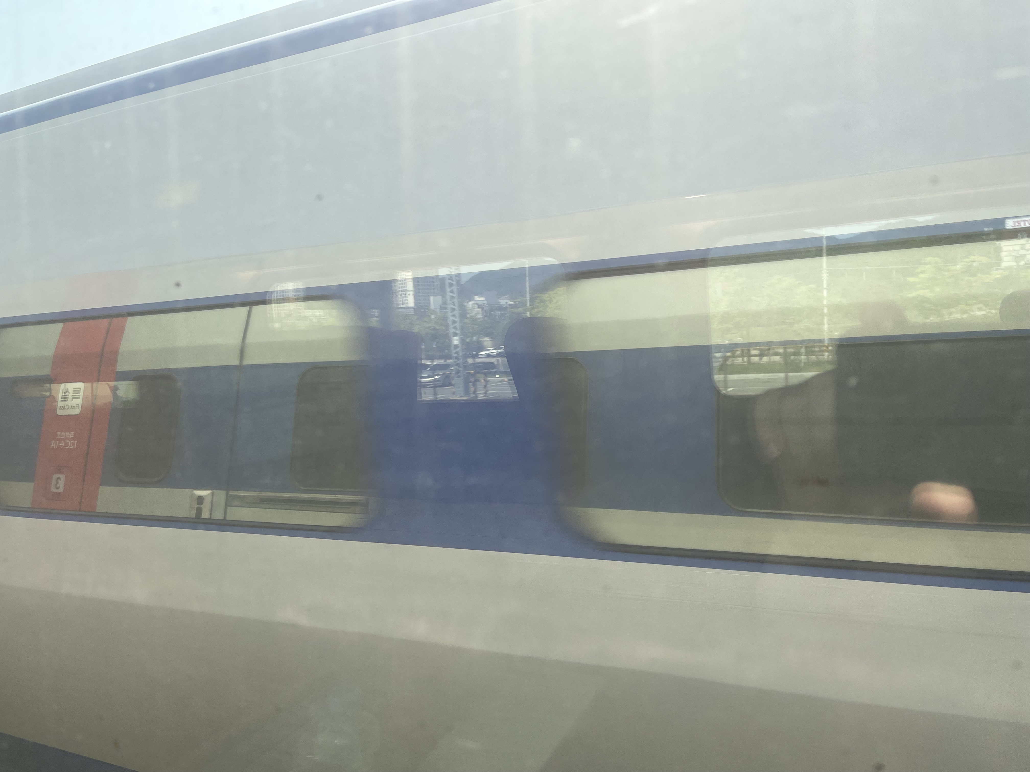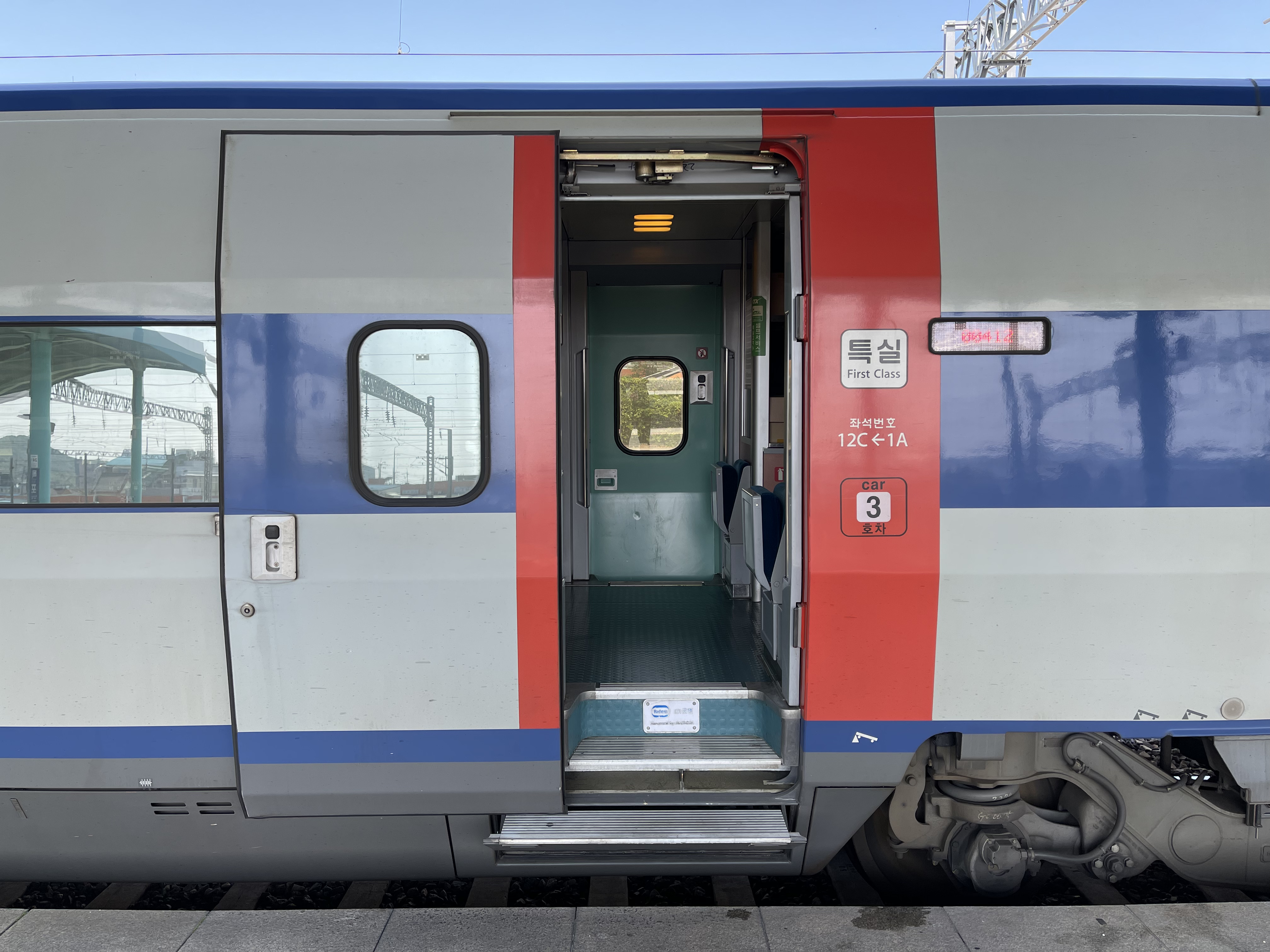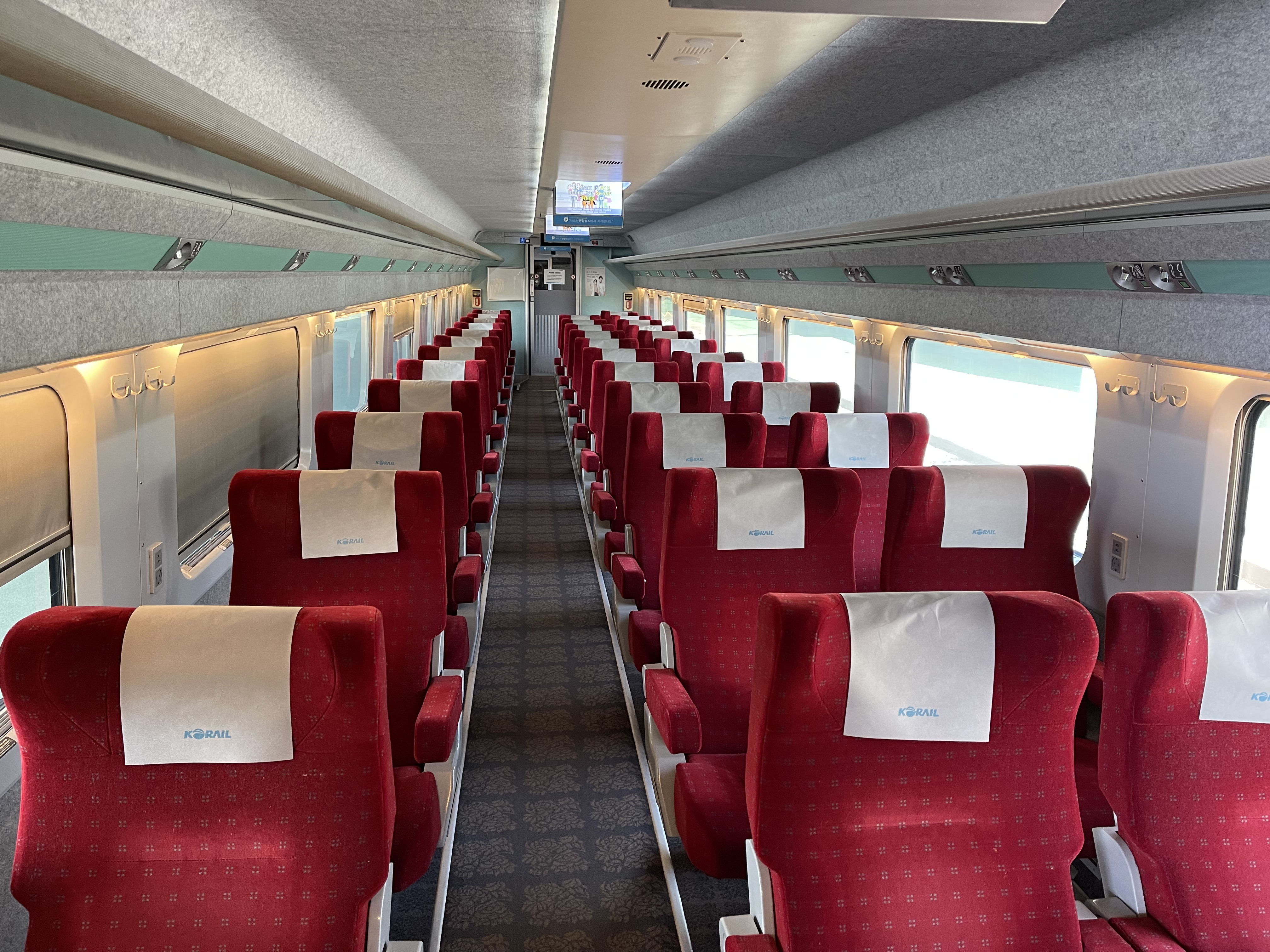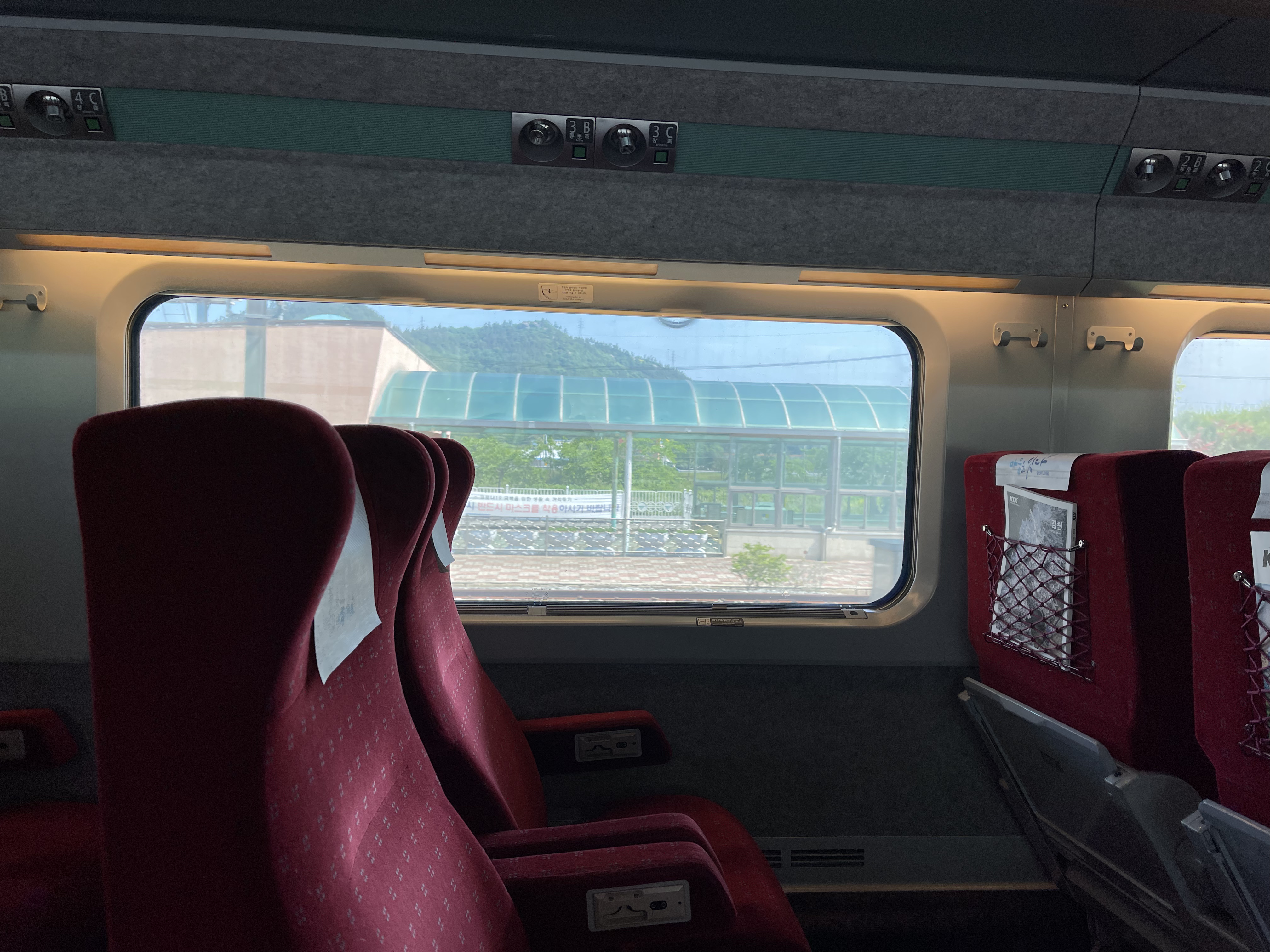 빨간 시트의 특실 시트들이 저를 맞이해 줍니다. KTX-1의 특실은 일반실과 다르게 한 줄에 좌석이 3개 있으며, 그 중에서는 1인석도 있어 혼자 여행하는 사람에게 매우 편리합니다.